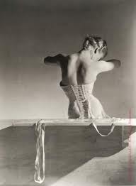This photograph, though quite simple, draws the eye in right away. First you notice the positioning of the head and arms. The woman’s arms are jutting out on both sides of her, sort of cradling her head as she looks down. This positioning also shows off her neck, which in turn elongates her back. The corset has clearly been loosened; there is evidence of this in the way that you see a slight gap between it and her body on the left side as well as the lacing that is strewn about on the bench behind her, as if she is discarding a piece of herself. This is also displayed in her back itself, which is not rigidly straight. One would expect a corset to constrict movement, not fulidify it. The room that which she’s in is barren, but she seems relieved, almost content; it makes the observer wonder what she is thinking about at that moment. Does she know how beautiful she is? And then there is of course the lines of her back themselves. The fact that they’re asymmetrical makes her back interesting. The positioning of her arms lends to a muscular tone to her back, which suggests strength. Despite the fact that this woman is turned away she possesses this strength that you cannot turn away from.